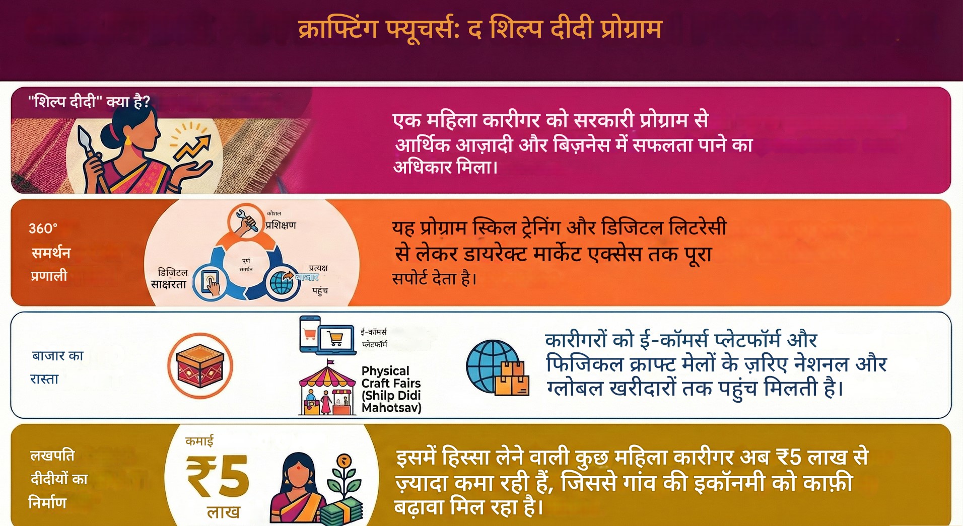 द Shilp Didi Programme यह साबित हो चुका है कि परिवर्तनकारी आंदोलन यह पहल वित्तीय सहायता से कहीं आगे बढ़कर, महिलाओं के हस्तशिल्प आधारित उद्यमशीलता के लिए एक सक्रिय पारिस्थितिकी तंत्र का निर्माण करती है। पारंपरिक कौशल को आधुनिक विपणन और डिजिटल प्रौद्योगिकी के साथ एकीकृत करके, यह पहल ग्रामीण अर्थव्यवस्थाओं को सफलतापूर्वक मजबूत करती है और भारतीय हस्तनिर्मित परंपराओं को स्थानीय से वैश्विक बाजारों तक पहुंचाती है। सशक्तिकरण का यह मॉडल इस दृष्टिकोण का केंद्रबिंदु है।Atmanirbhar Bharat और यह लक्ष्य को प्राप्त करने के लिए महत्वपूर्ण है।Viksit Bharat महिलाओं को आत्मनिर्भर रचनाकारों, नियोक्ताओं और सामुदायिक नेताओं के रूप में स्थापित करके।