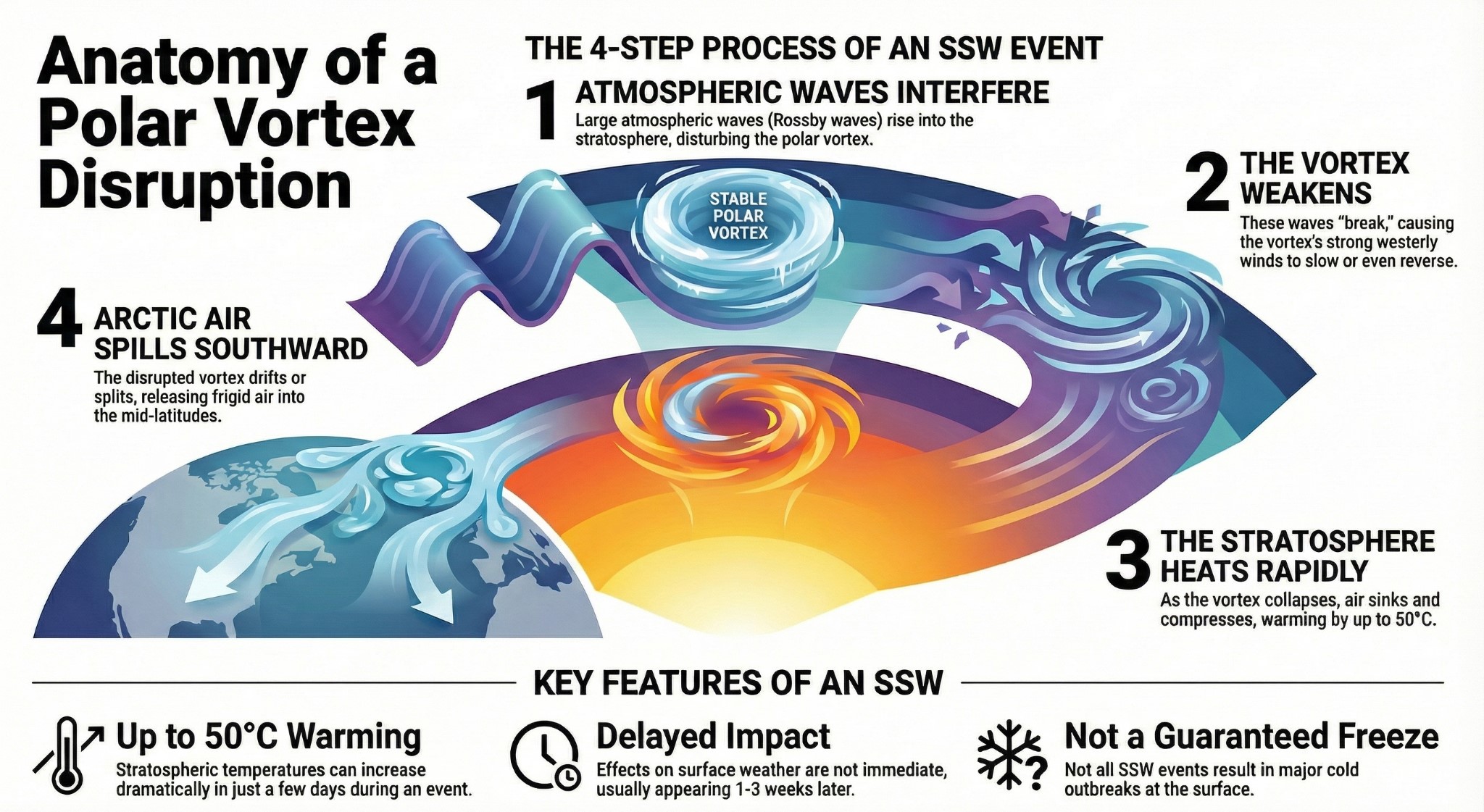 - प्राथमिक प्रभाव:यह अस्थिर करता है ध्रुवीय भंवर, मजबूत पश्चिमी हवाओं का बैंड जो आमतौर पर आर्कटिक के चारों ओर घूमता है, अक्सर जमीनी स्तर पर महत्वपूर्ण मौसम संबंधी विसंगतियों को जन्म देता है।