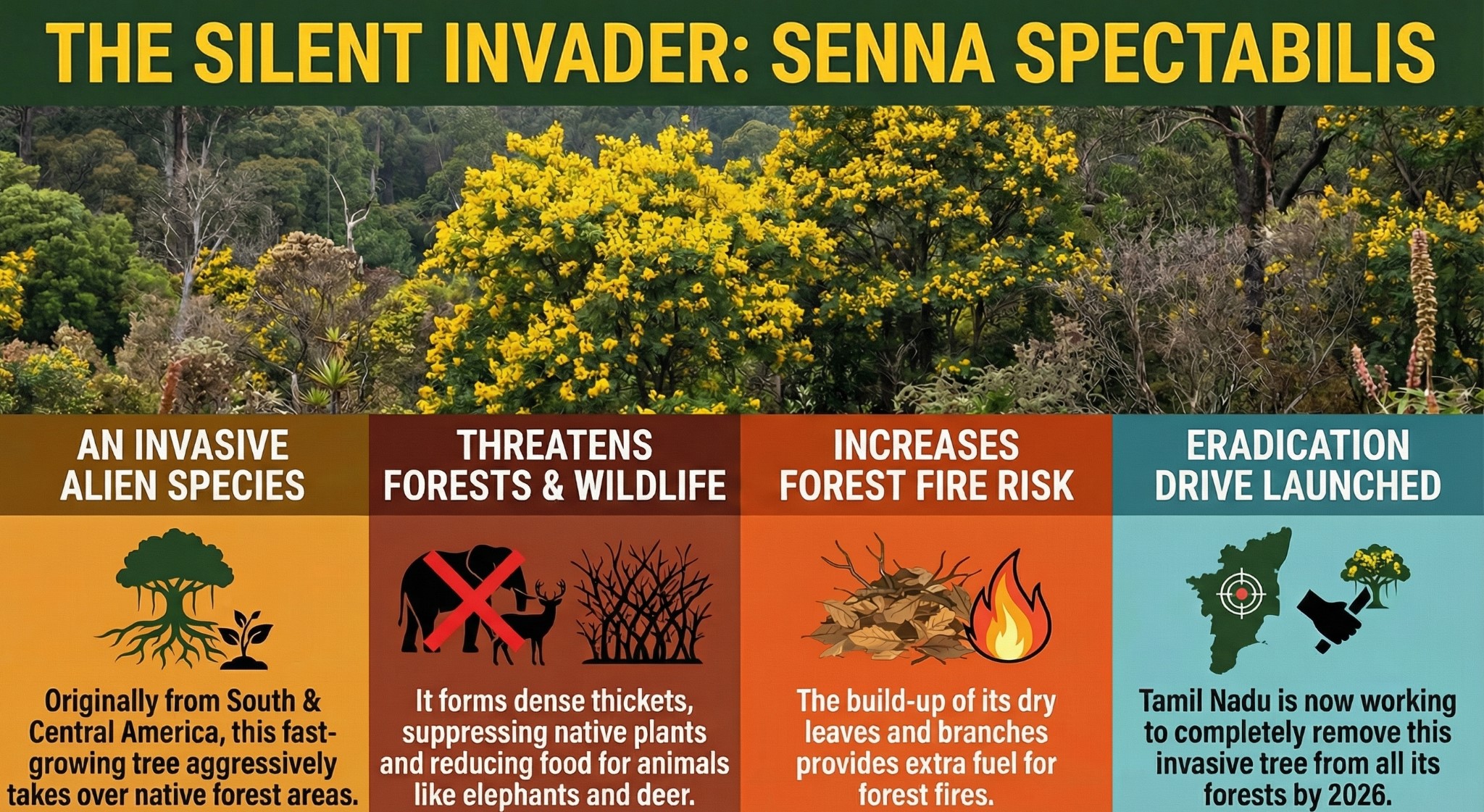 Tamil Nadu has launched one of India’s largest invasive-species eradication drives, targeting the complete removal of Senna spectabilis from all forest divisions by March 2026.