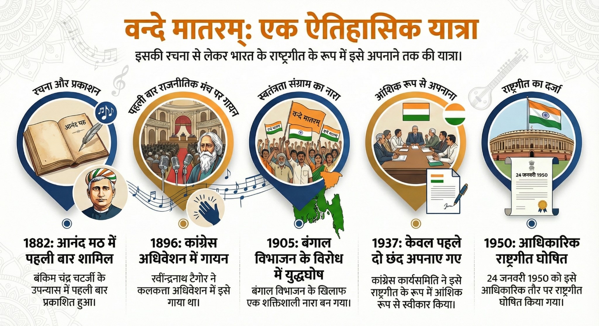 की 150वीं वर्षगांठ वंदे मातरम यह गीत भारत के स्वतंत्रता संग्राम, विशेषकर स्वदेशी आंदोलन में, उनकी महत्वपूर्ण भूमिका की याद दिलाता है। हालांकि इसके अपनाने और छंदों को लेकर राजनीतिक बहस जारी है, फिर भी यह भारतीय संस्कृति और राष्ट्रवाद का एक सशक्त प्रतीक बना हुआ है और राष्ट्रगान के साथ-साथ एक विशिष्ट स्थान रखता है।